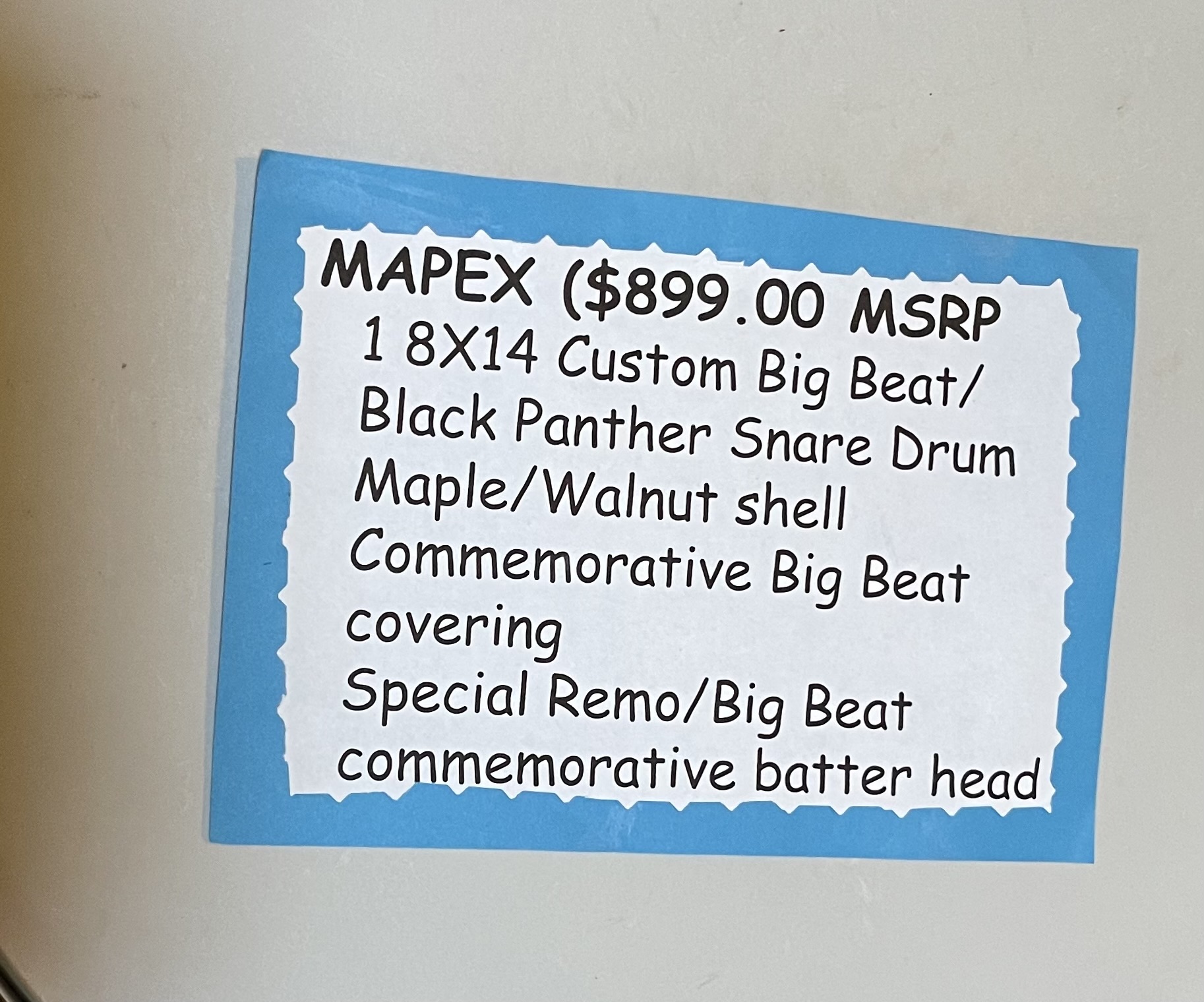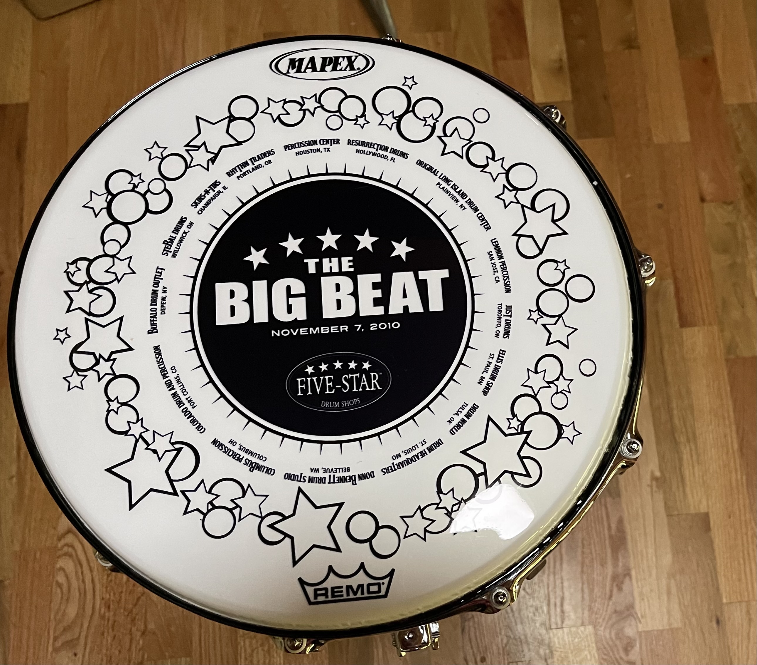"I have one of the Big Beat snares. I can provide a bit more info for you. The snares were produced for 5 Star Drum Shops in 2010 for a linked charity event that had all 15, 5 Star stores included. It was an offshoot of Woodstick that was the idea of Chris Kimble in the Pacific NW and sponsored by Donn Bennett Drum Shop. Chris had the idea of getting as many drummers as possible together and all playing the same drum beat for 5 minutes and setting a World Record. The first event was held in an Airplane Hanger, in Gig Harbor, WA. Through the years Woodstick included celebrity drummers, to include Michael Shrieve, Alan White, Michael Derosier, Tony, TC, Coleman, Carmine Appice, Brian Hitt, and Rich Redmond, just to name a few. The 2010 Woodstick was dubbed the Big Beat and all the 5 Star Drum Shops were linked via video when we played the same beat. Also included in these events were raffles and giveaways. The Mapex Big Beat Snare was one of the raffle prizes at the Seattle Event. I was lucky enough to win that snare. At the time there were 15, 5 Star Drum Shops.