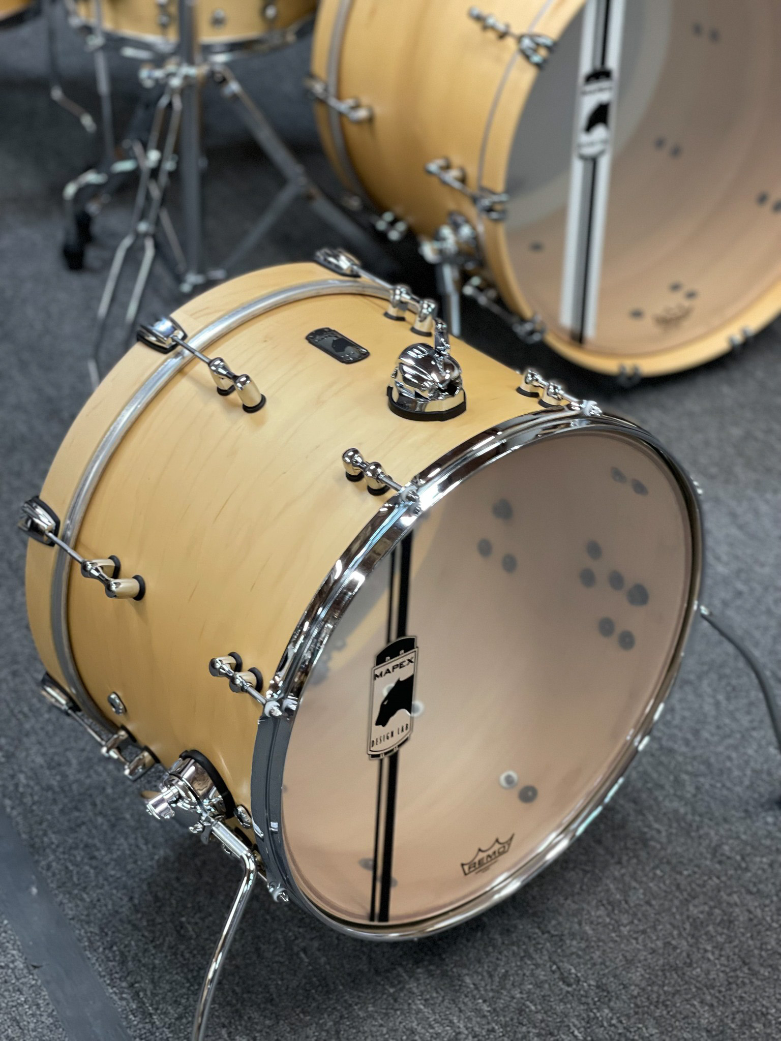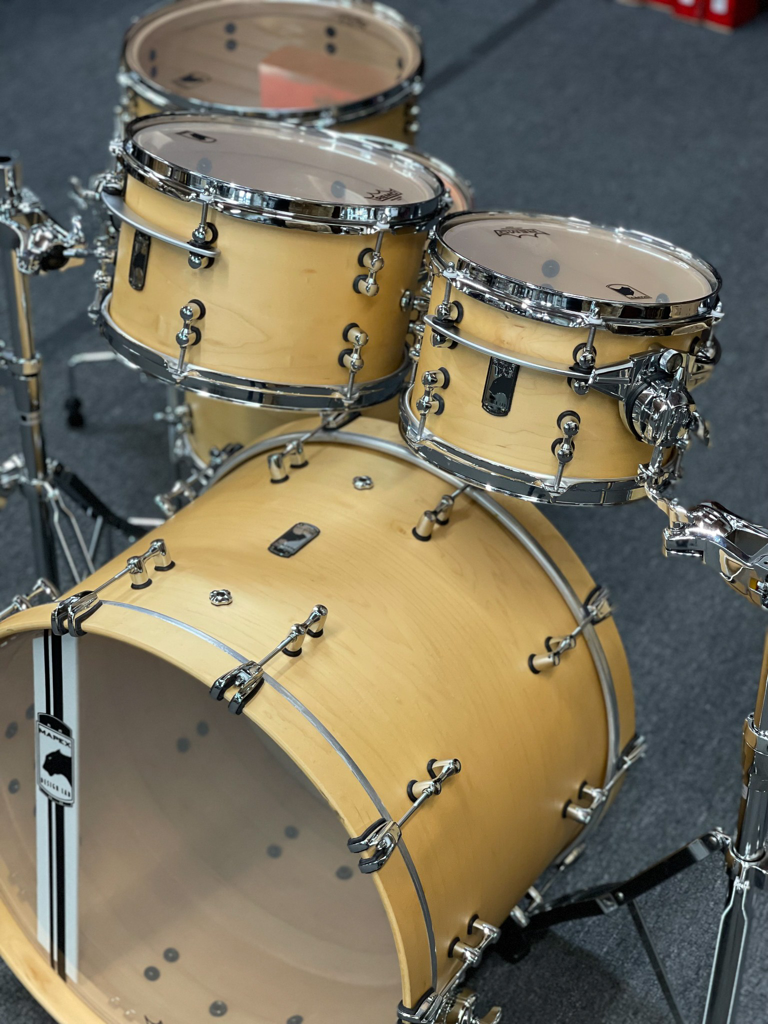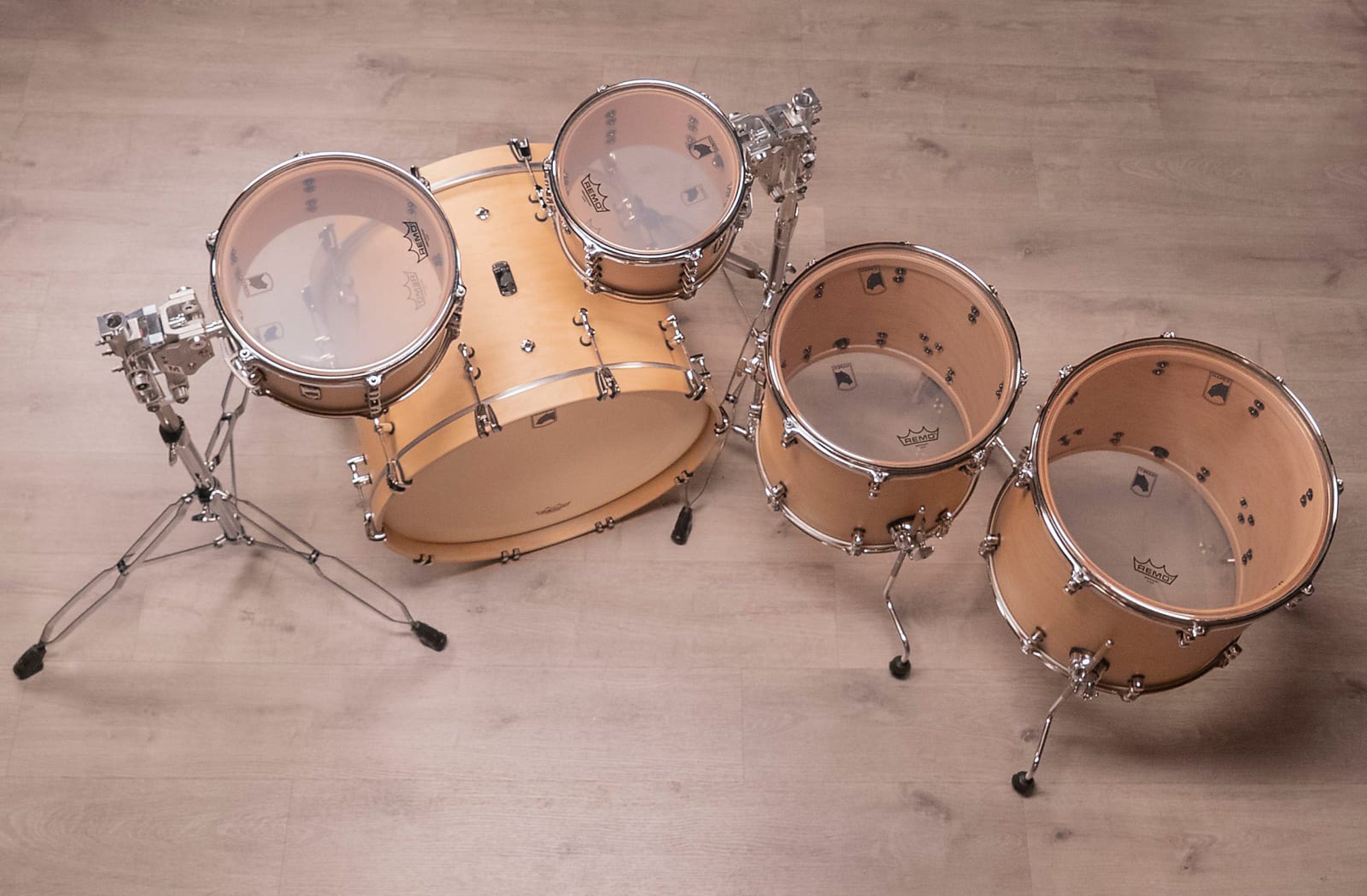 I've added the photos that Josh Beyers, General Manager, Denver Percussion posted on Facebook in late April 2023, which show the first kit I've seen to come with HALO tom mounts as standard, rather than being retrofitted by the store. According to Josh's post, these are now replacing the MAATS (Magnetic Air Adjustment Tom Suspension) mounts that have caused "some controversy"*, since their introduction as the only mounting option on the Design Lab kits. Personally I think it's a massive improvement, although I'd still prefer the option of the mounts used on Craig Blundell's Concert Tom kit. But that's just me - your mileage may vary.